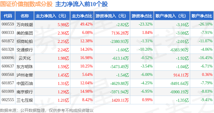 资金流向方面,国证价值(399371)指数成份股当日主力资金净流出合计47.23亿元,游资资金净流入合计20.51亿元,散户资金净流入合计26.72亿元。成份股资金流向详情见下表: