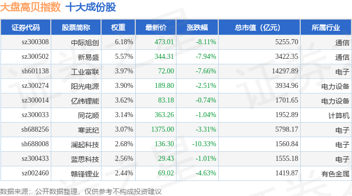 大盘高贝(399405)指数十大成份股详情如下: