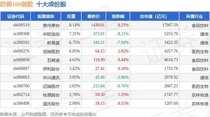 证券之星消息,10月31日,防御100(399403)指数报收于8773.21点,跌0.93%,成交1561.88亿元,换手率1.08%。当日该指数成份股中,上涨的有72家,海思科以10.0%的涨幅领涨,下跌的有26家,天孚通信以8.14%的跌幅领跌。
