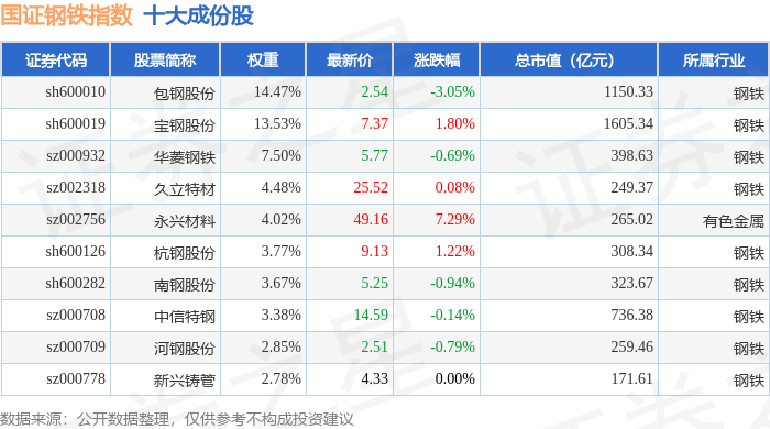 证券之星消息,10月31日,国证钢铁(399440)指数报收于1444.1点,涨0.13%,成交182.69亿元,换手率1.85%。当日该指数成份股中,上涨的有19家,大中矿业以9.98%的涨幅领涨,下跌的有20家,包钢股份以3.05%的跌幅领跌。