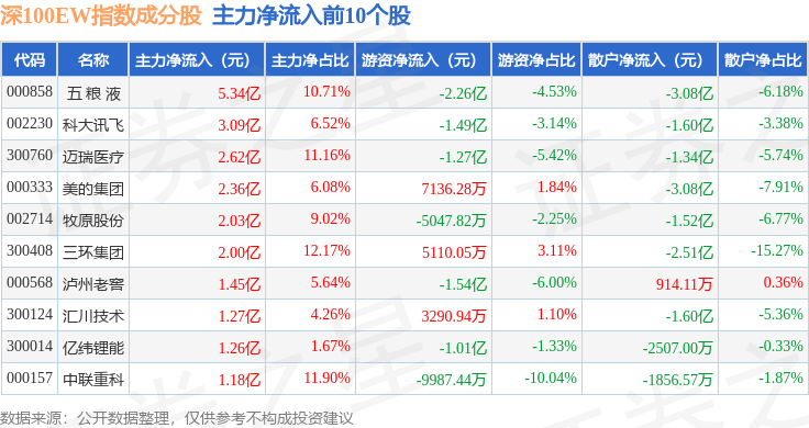 资金流向方面,深100EW(399632)指数成份股当日主力资金净流出合计192.55亿元,游资资金净流入合计65.86亿元,散户资金净流入合计126.69亿元。成份股资金流向详情见下表: