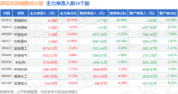 资金流向方面,深证环保(399638)指数成份股当日主力资金净流出合计63.6亿元,游资资金净流入合计5.74亿元,散户资金净流入合计57.85亿元。成份股资金流向详情见下表: