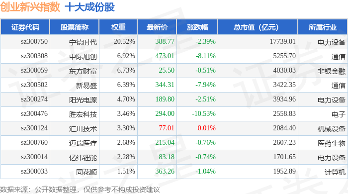 创业新兴(399643)指数十大成份股详情如下:
