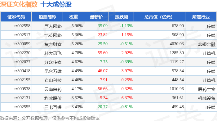 证券之星消息,10月31日,深证文化(399654)指数报收于2903.31点,涨2.02%,成交614.72亿元,换手率4.32%。当日该指数成份股中,上涨的有42家,蓝色光标以8.73%的涨幅领涨,下跌的有7家,天海防务以1.46%的跌幅领跌。