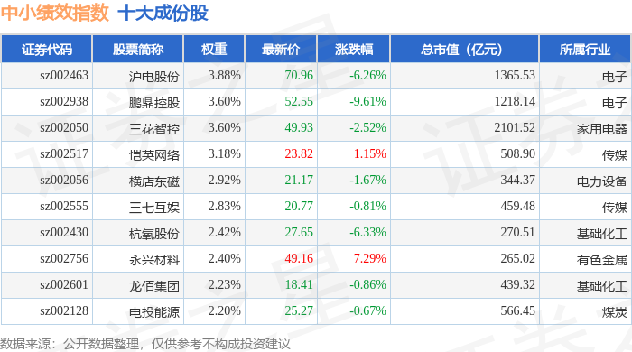 证券之星消息,10月31日,中小绩效(399658)指数报收于4860.56点,跌1.17%,成交1735.71亿元,换手率1.89%。当日该指数成份股中,上涨的有44家,海思科以10.0%的涨幅领涨,下跌的有55家,鹏鼎控股以9.61%的跌幅领跌。