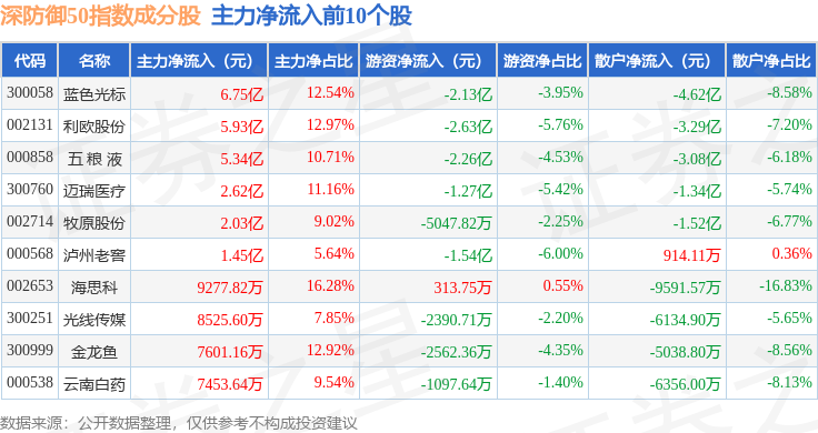 资金流向方面,深防御50(399671)指数成份股当日主力资金净流出合计46.37亿元,游资资金净流入合计23.54亿元,散户资金净流入合计22.83亿元。成份股资金流向详情见下表: