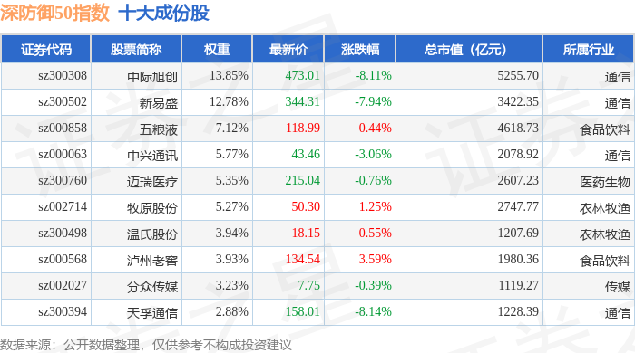 证券之星消息,10月31日,深防御50(399671)指数报收于9548.65点,跌2.1%,成交1099.43亿元,换手率2.77%。当日该指数成份股中,上涨的有37家,海思科以10.0%的涨幅领涨,下跌的有13家,天孚通信以8.14%的跌幅领跌。