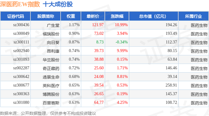 证券之星消息,10月31日,深医药EW(399676)指数报收于3919.24点,涨2.74%,成交722.2亿元,换手率3.01%。当日该指数成份股中,上涨的有203家,舒泰神以19.99%的涨幅领涨,下跌的有15家,可孚医疗以4.35%的跌幅领跌。