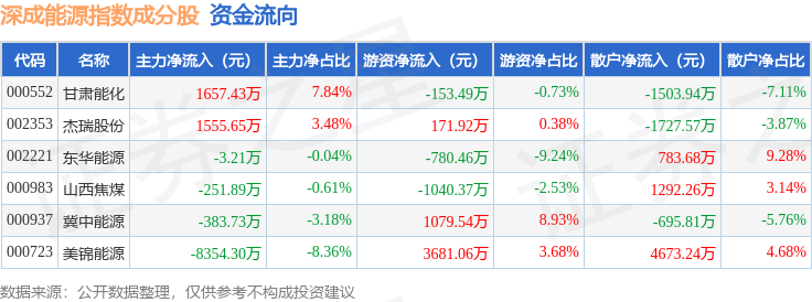 资金流向方面,深成能源(399680)指数成份股当日主力资金净流出合计5780.06万元,游资资金净流入合计2958.21万元,散户资金净流入合计2821.86万元。成份股资金流向详情见下表: