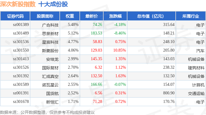 证券之星消息,10月31日,深次新股(399678)指数报收于580.43点,涨0.12%,成交143.91亿元,换手率4.46%。当日该指数成份股中,上涨的有74家,斯菱股份以10.85%的涨幅领涨,下跌的有26家,思泉新材以8.46%的跌幅领跌。