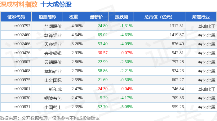 证券之星消息,10月31日,深成材料(399681)指数报收于1180.26点,跌1.11%,成交960.16亿元,换手率2.29%。当日该指数成份股中,上涨的有30家,大中矿业以9.98%的涨幅领涨,下跌的有46家,中钨高新以10.0%的跌幅领跌。