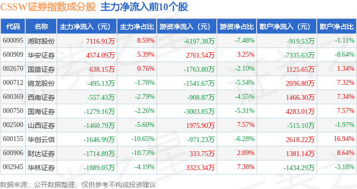资金流向方面,CSSW证券(399707)指数成份股当日主力资金净流出合计46.14亿元,游资资金净流入合计19.75亿元,散户资金净流入合计26.39亿元。成份股资金流向详情见下表: