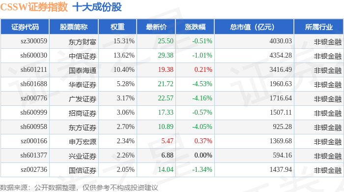 证券之星消息,10月31日,CSSW证券(399707)指数报收于6768.62点,跌1.08%,成交496.85亿元,换手率1.5%。当日该指数成份股中,上涨的有8家,长江证券以2.2%的涨幅领涨,下跌的有38家,华泰证券以4.53%的跌幅领跌。