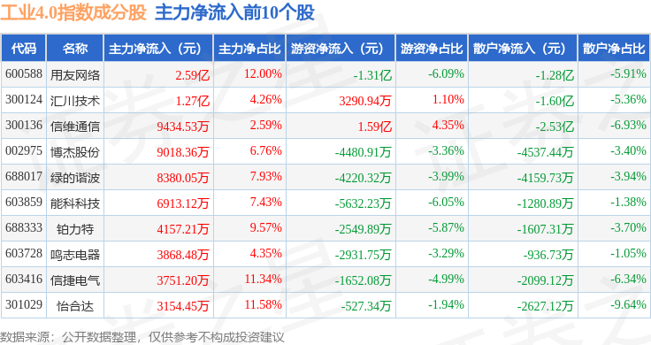资金流向方面,工业4.0(399803)指数成份股当日主力资金净流出合计101.83亿元,游资资金净流入合计27.59亿元,散户资金净流入合计74.23亿元。成份股资金流向详情见下表: