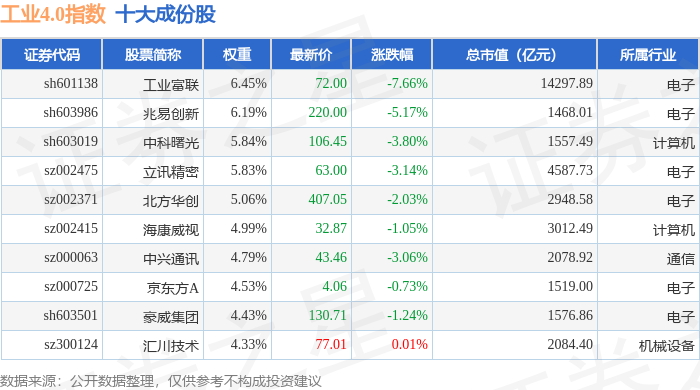 证券之星消息,10月31日,工业4.0(399803)指数报收于5477.16点,跌1.84%,成交1180.5亿元,换手率2.19%。当日该指数成份股中,上涨的有45家,信捷电气以7.87%的涨幅领涨,下跌的有34家,杰普特以8.18%的跌幅领跌。