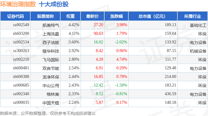 资金流向方面,环境治理(399806)指数成份股当日主力资金净流出合计3.57亿元,游资资金净流出合计2590.09万元,散户资金净流入合计3.83亿元。成份股资金流向详情见下表: