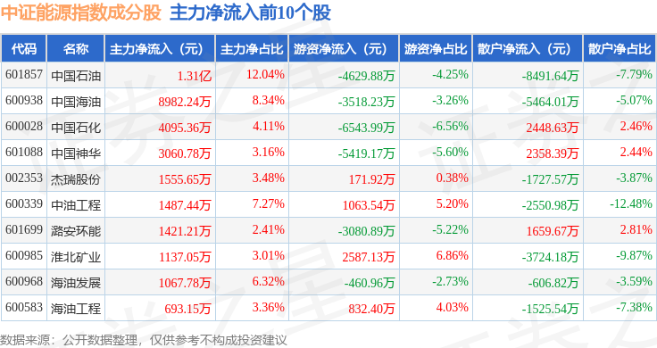 资金流向方面,中证能源(399928)指数成份股当日主力资金净流入合计9499.93万元,游资资金净流出合计1.99亿元,散户资金净流入合计1.04亿元。成份股资金流向详情见下表: