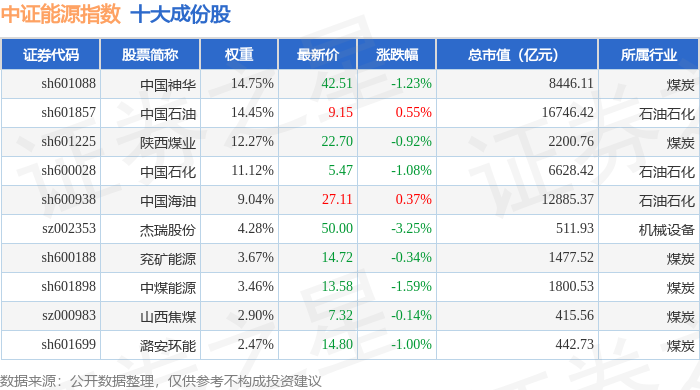 证券之星消息,10月31日,中证能源(399928)指数报收于2893.34点,跌0.68%,成交116.61亿元,换手率0.36%。当日该指数成份股中,上涨的有5家,山煤国际以1.66%的涨幅领涨,下跌的有19家,杰瑞股份以3.25%的跌幅领跌。