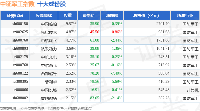 资金流向方面,中证军工(399967)指数成份股当日主力资金净流出合计45.12亿元,游资资金净流入合计11.15亿元,散户资金净流入合计33.97亿元。成份股资金流向详情见下表: