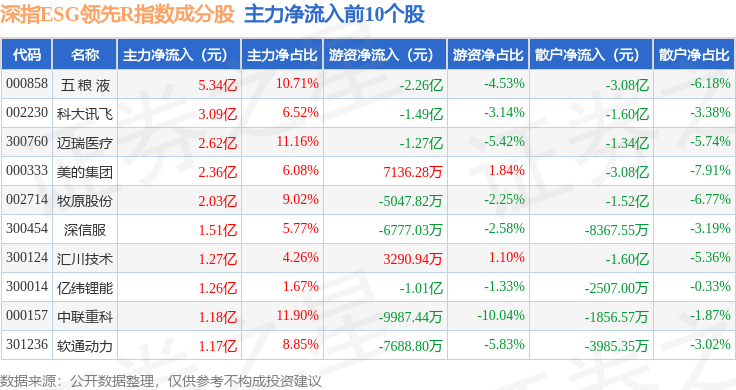 资金流向方面,深指ESG领先R(470029)指数成份股当日主力资金净流出合计234.2亿元,游资资金净流入合计79.1亿元,散户资金净流入合计155.1亿元。成份股资金流向详情见下表: