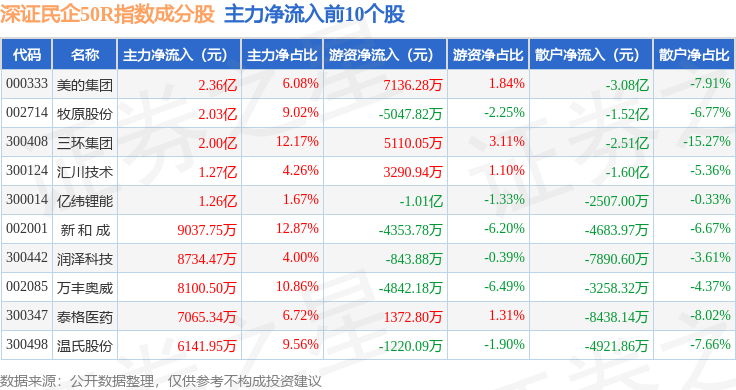 资金流向方面,深证民企50R(470057)指数成份股当日主力资金净流出合计150.17亿元,游资资金净流入合计53.75亿元,散户资金净流入合计96.42亿元。成份股资金流向详情见下表: