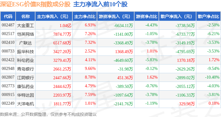 资金流向方面,深证ESG价值R(470061)指数成份股当日主力资金净流出合计39.33亿元,游资资金净流入合计16.22亿元,散户资金净流入合计23.11亿元。成份股资金流向详情见下表: