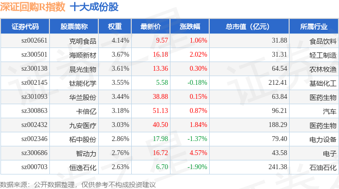 证券之星消息,10月31日,深证回购R(470063)指数报收于3101.17点,涨1.14%,成交228.92亿元,换手率1.7%。当日该指数成份股中,上涨的有37家,华源控股以9.97%的涨幅领涨,下跌的有10家,凯莱英以4.33%的跌幅领跌。