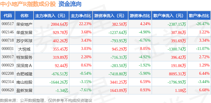 资金流向方面,中小地产R(471002)指数成份股当日主力资金净流出合计1.16亿元,游资资金净流出合计4038.07万元,散户资金净流入合计1.57亿元。成份股资金流向详情见下表: