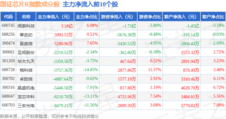 资金流向方面,国证芯片R(480017)指数成份股当日主力资金净流出合计102.18亿元,游资资金净流入合计50.19亿元,散户资金净流入合计51.99亿元。成份股资金流向详情见下表: