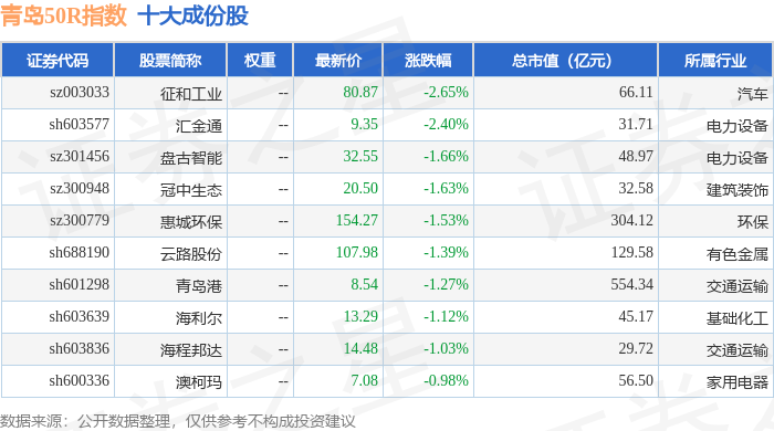 青岛50R(489011)指数十大成份股详情如下: