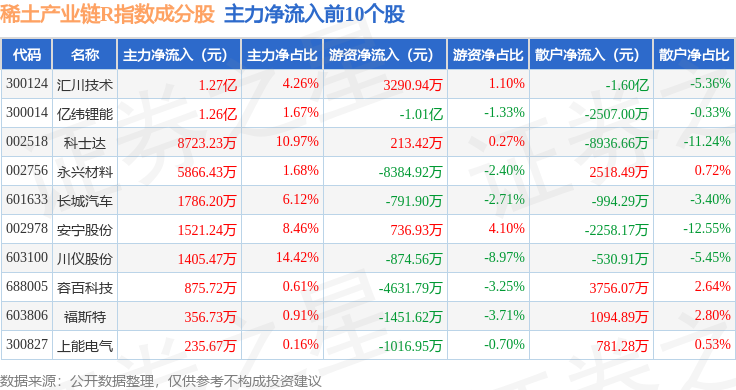 资金流向方面,稀土产业链R(489013)指数成份股当日主力资金净流出合计80.78亿元,游资资金净流入合计18.18亿元,散户资金净流入合计62.6亿元。成份股资金流向详情见下表: