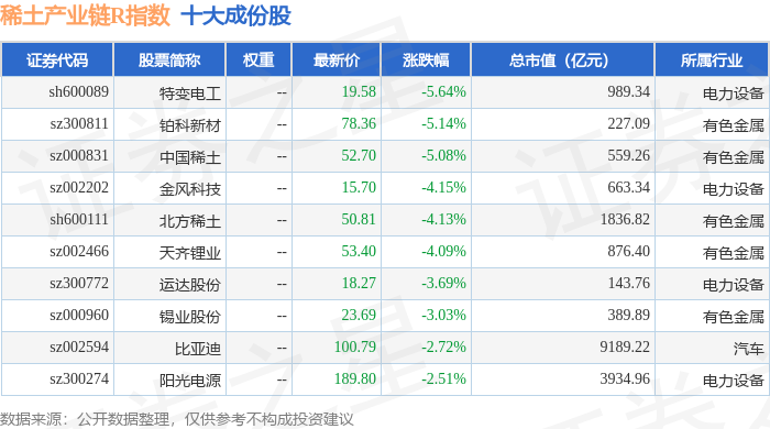 证券之星消息,10月31日,稀土产业链R(489013)指数报收于4123.59点,跌1.96%,成交1136.89亿元,换手率2.71%。当日该指数成份股中,上涨的有12家,永兴材料以7.29%的涨幅领涨,下跌的有38家,特变电工以5.64%的跌幅领跌。