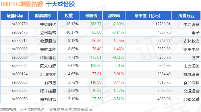 证券之星消息,10月31日,100ESG增强(970033)指数报收于1562.05点,跌1.79%,成交1598.81亿元,换手率1.66%。当日该指数成份股中,上涨的有20家,古井贡酒以6.38%的涨幅领涨,下跌的有20家,鹏鼎控股以9.61%的跌幅领跌。
