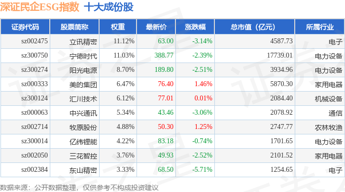 资金流向方面,深证民企ESG(970056)指数成份股当日主力资金净流出合计84.64亿元,游资资金净流入合计25.19亿元,散户资金净流入合计59.46亿元。成份股资金流向详情见下表: