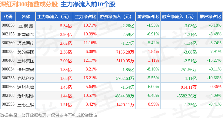 资金流向方面,深红利300(970062)指数成份股当日主力资金净流出合计95.73亿元,游资资金净流入合计9.7亿元,散户资金净流入合计86.03亿元。成份股资金流向详情见下表: