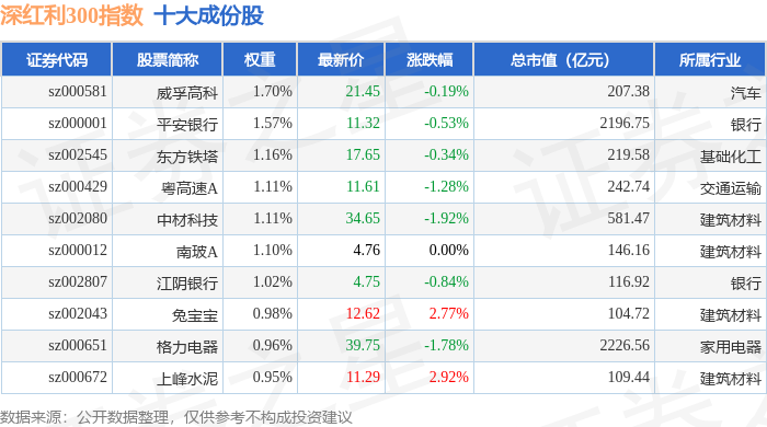 证券之星消息,10月31日,深红利300(970062)指数报收于5572.29点,涨0.18%,成交2272.36亿元,换手率2.08%。当日该指数成份股中,上涨的有182家,硅宝科技以7.58%的涨幅领涨,下跌的有112家,鹏鼎控股以9.61%的跌幅领跌。