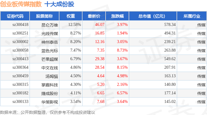 证券之星消息,10月31日,创业板传媒(970084)指数报收于1341.94点,涨4.41%,成交317.65亿元,换手率7.75%。当日该指数成份股中,上涨的有41家,福石控股以20.09%的涨幅领涨。