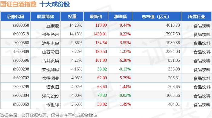 证券之星消息,10月31日,国证白酒(980031)指数报收于68547.47点,涨1.28%,成交230.22亿元,换手率1.15%。当日该指数成份股中,上涨的有19家,古井贡酒以6.38%的涨幅领涨,下跌的有6家,豫园股份以3.47%的跌幅领跌。