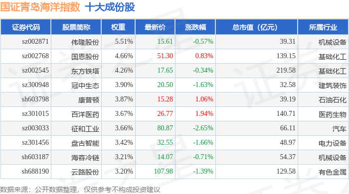 国证青岛海洋(980532)指数十大成份股详情如下: