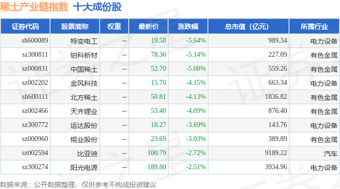 证券之星消息,10月31日,稀土产业链(989013)指数报收于3788.86点,跌1.96%,成交1136.89亿元,换手率2.71%。当日该指数成份股中,上涨的有12家,永兴材料以7.29%的涨幅领涨,下跌的有38家,特变电工以5.64%的跌幅领跌。