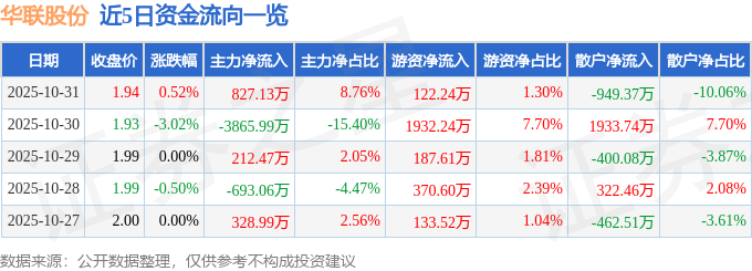 证券之星消息,截至2025年10月31日收盘,华联股份(000882)报收于1.94元,上涨0.52%,换手率1.78%,成交量48.63万手,成交额9436.77万元。