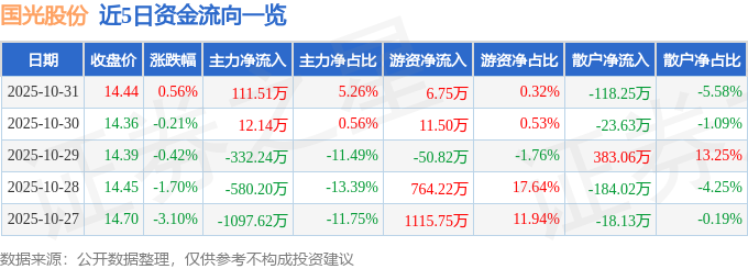 10月31日的资金流向数据方面,主力资金净流入111.51万元,占总成交额5.26%,游资资金净流入6.75万元,占总成交额0.32%,散户资金净流出118.25万元,占总成交额5.58%。