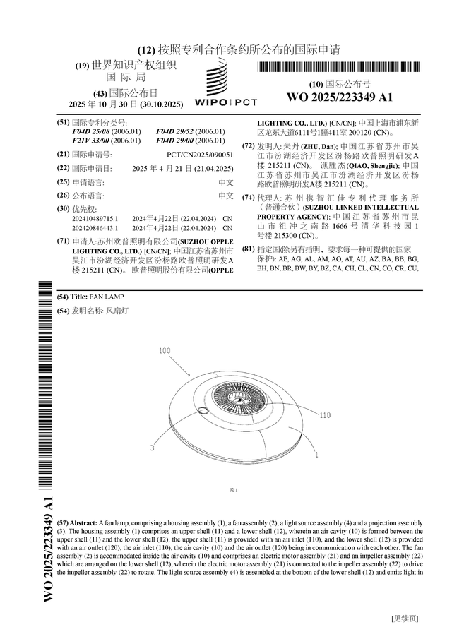 证券之星消息,根据企查查数据显示欧普照明(603515)公布了一项国际专利申请,专利名为“风扇灯”,专利申请号为PCT/CN2025/090051,国际公布日为2025年10月30日。