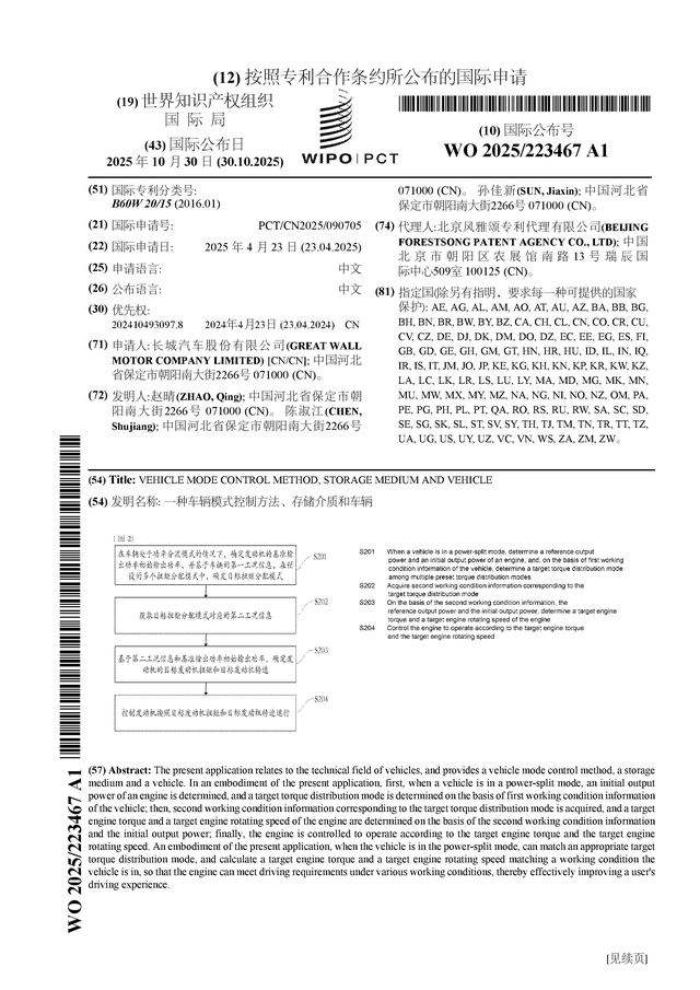 证券之星消息,根据企查查数据显示长城汽车(601633)公布了一项国际专利申请,专利名为“一种车辆模式控制方法、存储介质和车辆”,专利申请号为PCT/CN2025/090705,国际公布日为2025年10月30日。