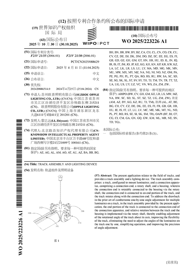 证券之星消息,根据企查查数据显示欧普照明(603515)公布了一项国际专利申请,专利名为“轨道组件及照明设备”,专利申请号为PCT/CN2025/088629,国际公布日为2025年10月30日。