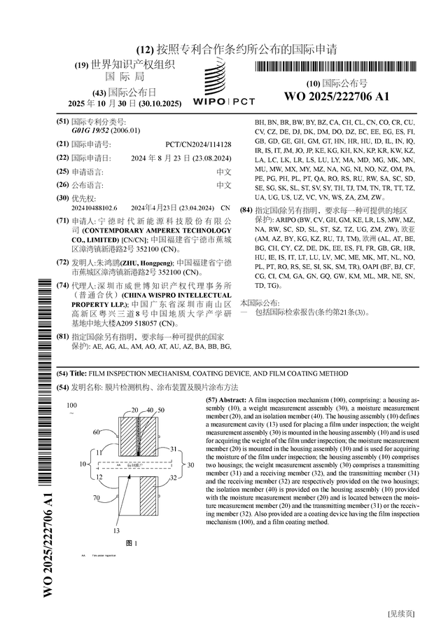 证券之星消息,根据企查查数据显示宁德时代(300750)公布了一项国际专利申请,专利名为“膜片检测机构、涂布装置及膜片涂布方法”,专利申请号为PCT/CN2024/114128,国际公布日为2025年10月30日。