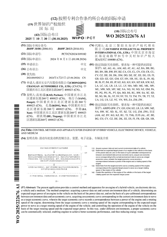 证券之星消息,根据企查查数据显示长安汽车(000625)公布了一项国际专利申请,专利名为“混动车的发动机控制方法、装置、电子设备、车辆及介质”,专利申请号为PCT/CN2024/109182,国际公布日为2025年10月30日。