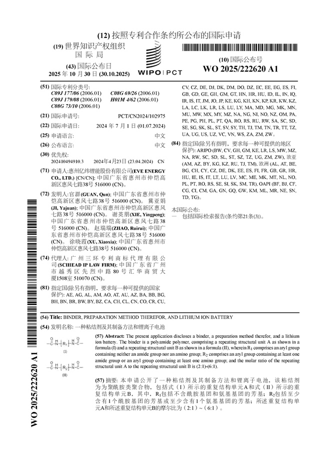 证券之星消息,根据企查查数据显示亿纬锂能(300014)公布了一项国际专利申请,专利名为“一种粘结剂及其制备方法和锂离子电池”,专利申请号为PCT/CN2024/102975,国际公布日为2025年10月30日。