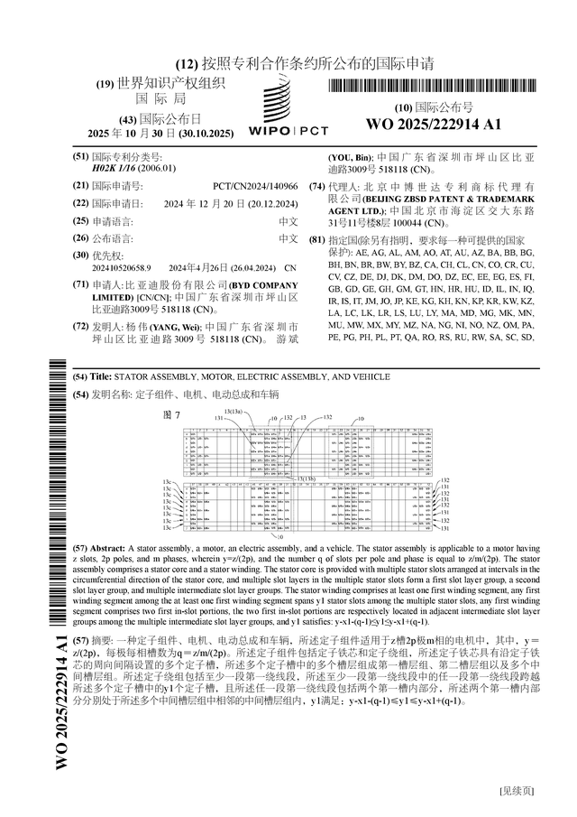 证券之星消息,根据企查查数据显示比亚迪(002594)公布了一项国际专利申请,专利名为“定子组件、电机、电动总成和车辆”,专利申请号为PCT/CN2024/140966,国际公布日为2025年10月30日。