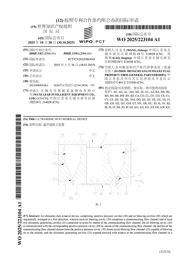 证券之星消息,根据企查查数据显示先导智能(300450)公布了一项国际专利申请,专利名为“超声波除尘装置”,专利申请号为PCT/CN2025/083045,国际公布日为2025年10月30日。